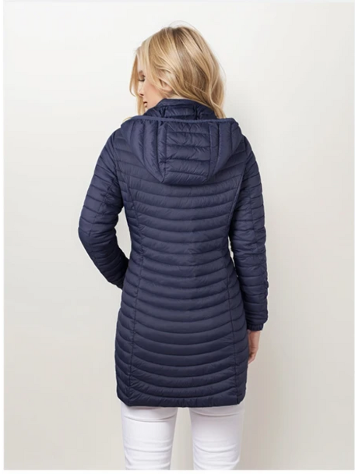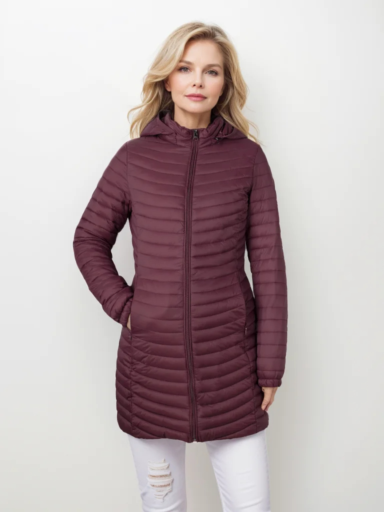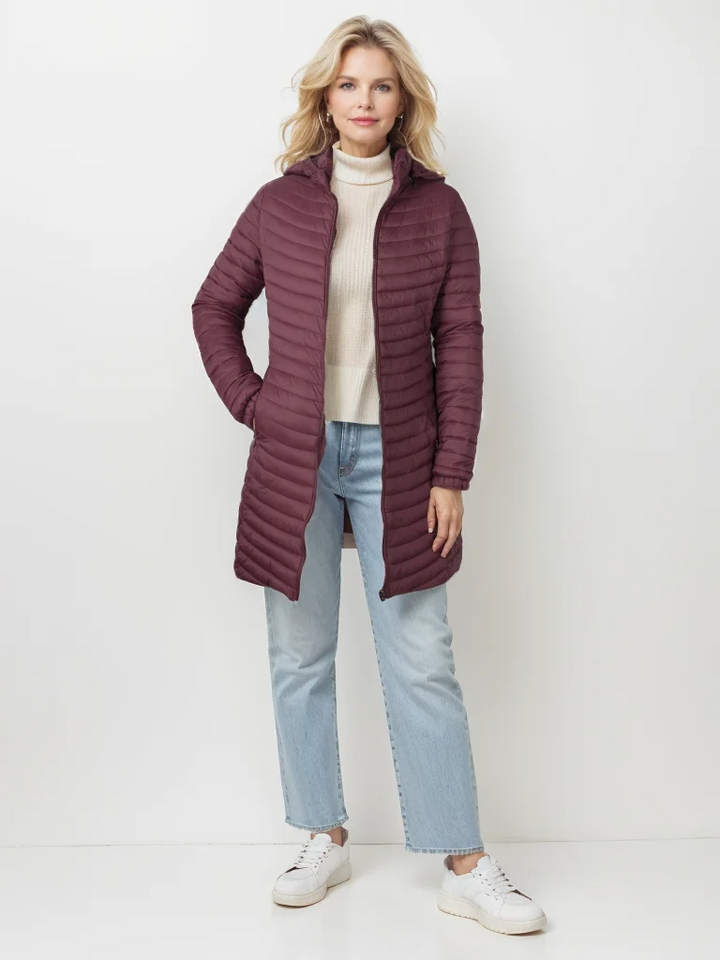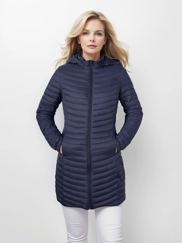 Ervaar de ultieme combinatie van elegantie en comfort met de Alena lange donsjas met capuchon. Deze lichtgewicht donsjas biedt een verfijnde uitstraling met zijn lange snit en comfortabele pasvorm. De elegante kraag voegt een extra dimensie van stijl toe, terwijl de lichtgewicht vulling je warm houdt zonder in te boeten op draaggemak. Ideaal voor elke gelegenheid, van casual tot chic.