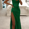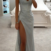 Trek de aandacht op je volgende evenement met deze glamoureuze avondjurk voor dames , ontworpen voor elegantie, drama en sprankeling. Deze lange jurk is gemaakt van glinsterende paillettenstof met een vloeiende A-lijn en heeft delicate spaghettibandjes, een off-shoulder detail en een opvallende hoge split voor extra allure.