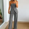 Blijf moeiteloos chic met deze minimalistische tweedelige modeset, ontworpen voor warme dagen en veelzijdige styling. De set bestaat uit een mouwloos, strapless tanktopje met knoopdetail, gecombineerd met een hoog getailleerde broek tot aan de enkels voor een strak, modern silhouet. De outfit is gemaakt van een ademende polyester-katoenmix en biedt lichtgewicht comfort met een normale pasvorm die perfect is voor casual uitjes, brunches of relaxte evenementen.