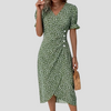 Stap de zomer in met tijdloze elegantie in deze elegante midi-jurk met bloemenprint , gemaakt met een luchtig silhouet en vintage-geïnspireerde details. De flatterende V-hals, zachte pofmouwen en gerimpelde taille creëren samen een vrouwelijk silhouet, terwijl het bloemenpatroon en de geplooide A-lijn beweging en charme toevoegen.