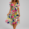 Maak een blijvende indruk met deze elegante jurk met diepe V-hals en print, ontworpen om je silhouet te accentueren met charme en zelfvertrouwen. Deze nauwsluitende jurk tot halverwege de kuit is gemaakt van lichtgewicht polyester met lichte stretch en heeft een flatterend A-lijn silhouet dat sierlijk met je bewegingen meebeweegt. De levendige print, gecombineerd met korte mouwen en een pullovermodel, maakt hem een ideale keuze voor zowel overdag als 's avonds.