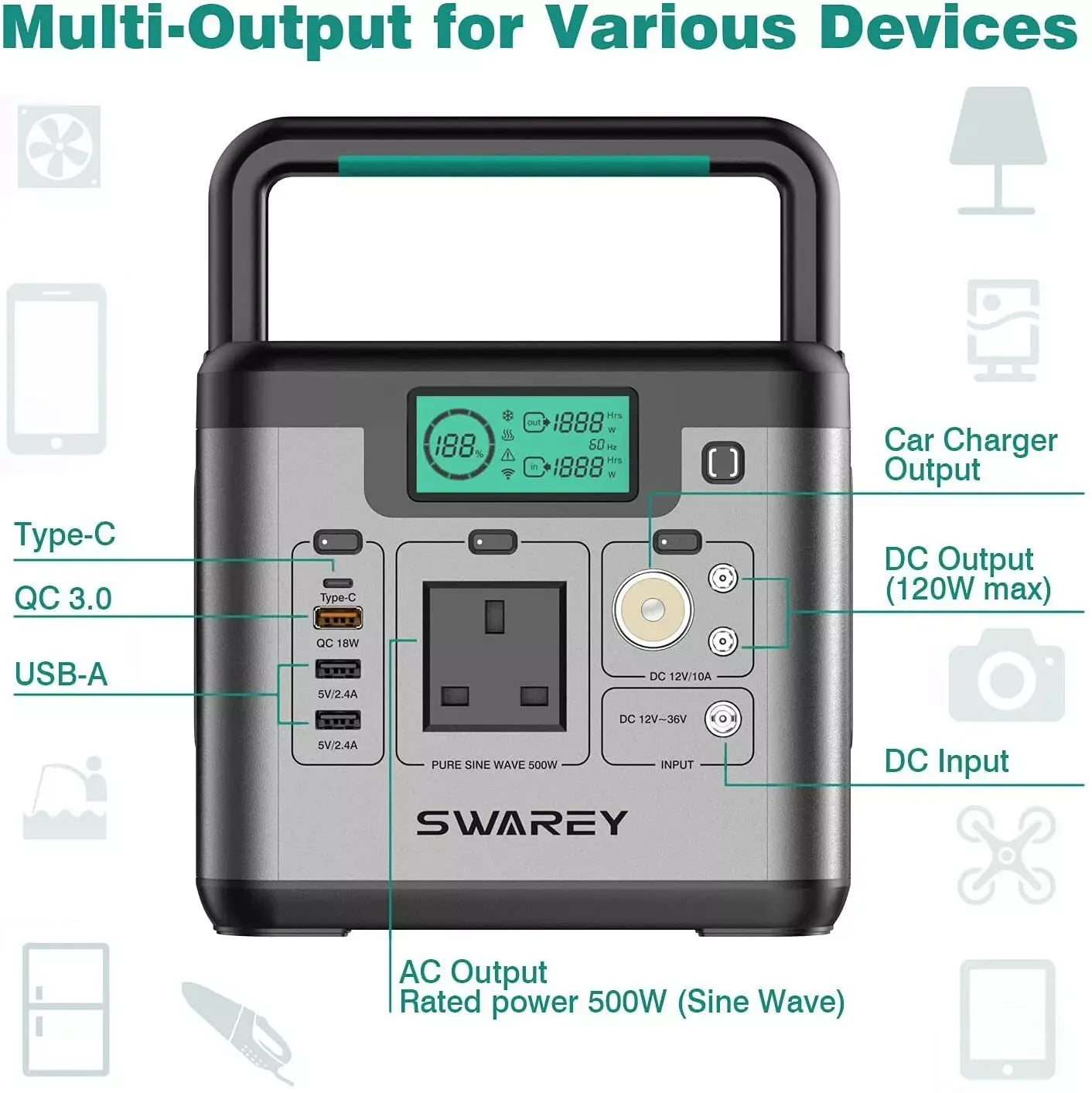 SWAREY S500 Pro - Draagbare Zonne-Energiegenerator Compacte krachtcentrale, ideaal voor kamperen, noodgevallen en off-grid toepassingen.