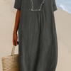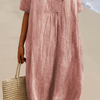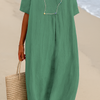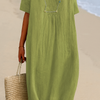 Stap in de elegantie van een strandjurk met een luchtig, relaxed silhouet, perfect voor vakantie of een casual zomerdag. Gemaakt van lichtgewicht, ademend materiaal, heeft hij een flatterende V-hals en soepel vallende korte mouwen. Deze moeiteloze jurk combineert prachtig met sandalen of een hoed met brede rand, zodat je er verzorgd uitziet en je comfortabel voelt, of je nu langs de kust wandelt of geniet van een strandcafé.