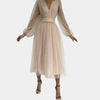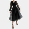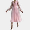 Deze stijlvolle midi-jurk straalt tijdloze elegantie uit. De lichte polyesterstof en subtiele stretch zorgen voor een comfortabele pasvorm, terwijl de V-hals en lantern sleeves een verfijnde uitstraling geven. Perfect voor zomerse gelegenheden.